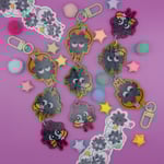 llaveros acrílicos de unos 10-12 centímetros de largo (son de eslabones, cada charm mide unos 4 centímetros), a doble cara y con acabado liso (no purpurina).